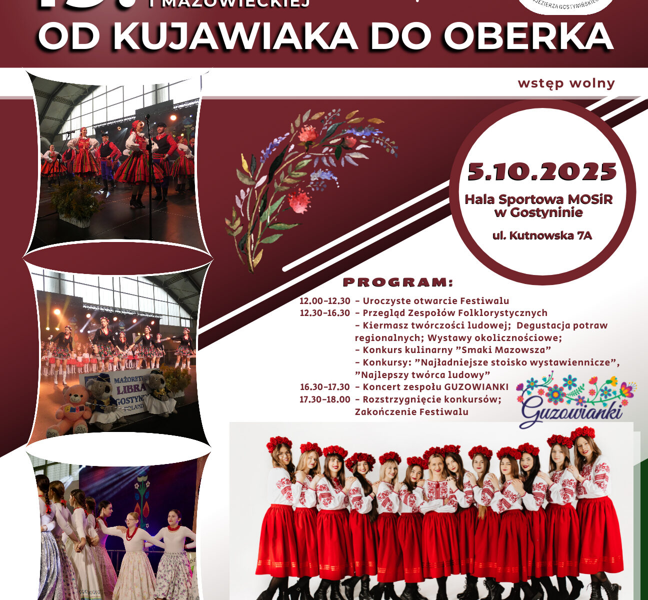 Serdecznie zapraszamy do udziału w Przeglądzie Zespołów Folklorystycznych, który odbędzie się na corocznym 19 już Festiwalu Folkloru i Kultury Ziemi Kujawskiej i Mazowieckiej „Od Kujawiaka do Oberka” dnia 5 października 2025 r. w Hali Sportowej MOSiR przy ul. Kutnowskiej 7A (koło basenu) w Gostyninie.