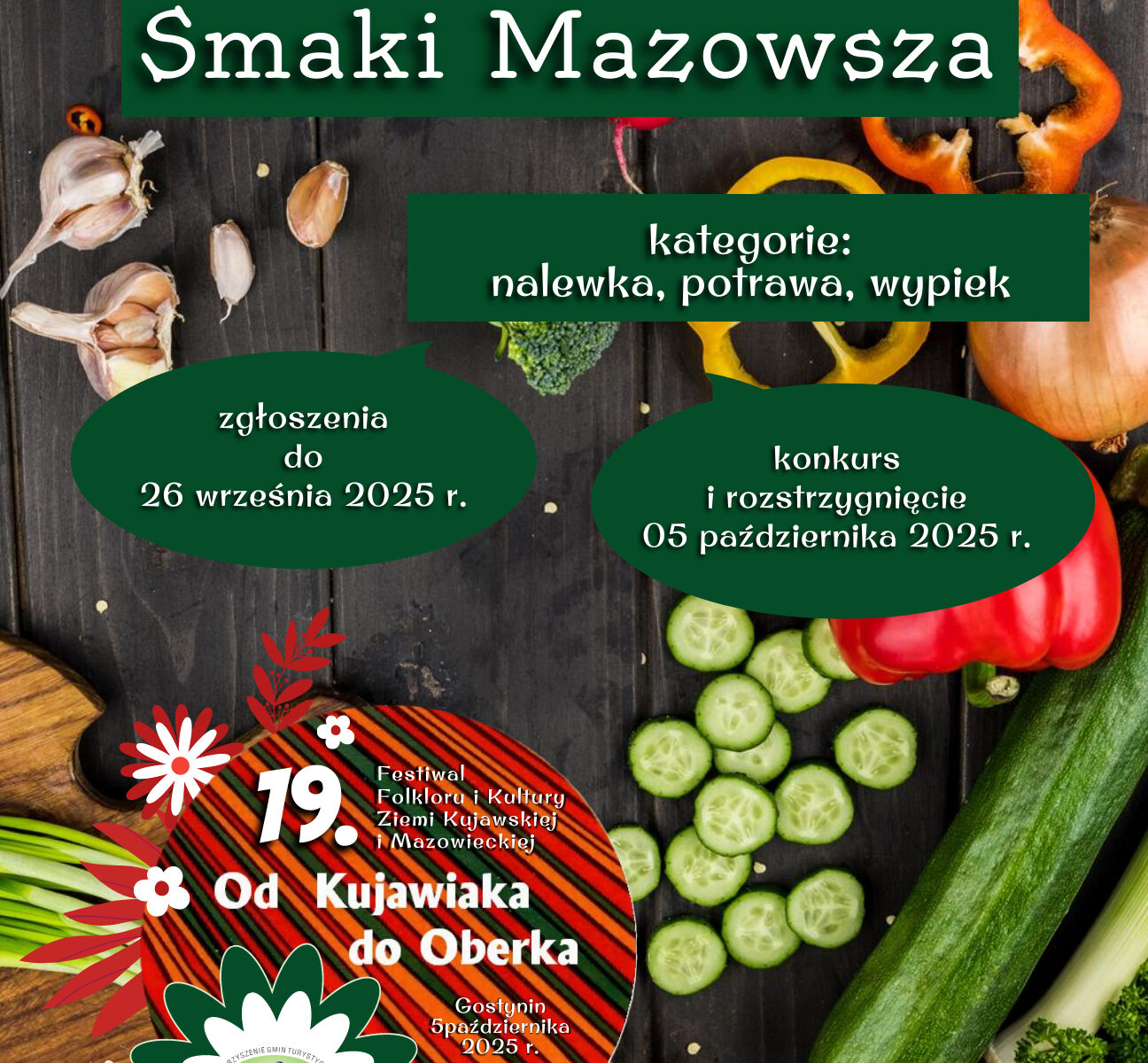 Serdecznie zapraszamy do udziału w konkursie kulinarnym „Smaki Mazowsza”, który odbędzie się na corocznym 19 już Festiwalu Folkloru i Kultury Ziemi Kujawskiej i Mazowieckiej „Od Kujawiaka do Oberka” dnia 5 października 2025 r. w Hali Sportowej MOSiR przy ul. Kutnowskiej 7A (koło basenu) w Gostyninie.