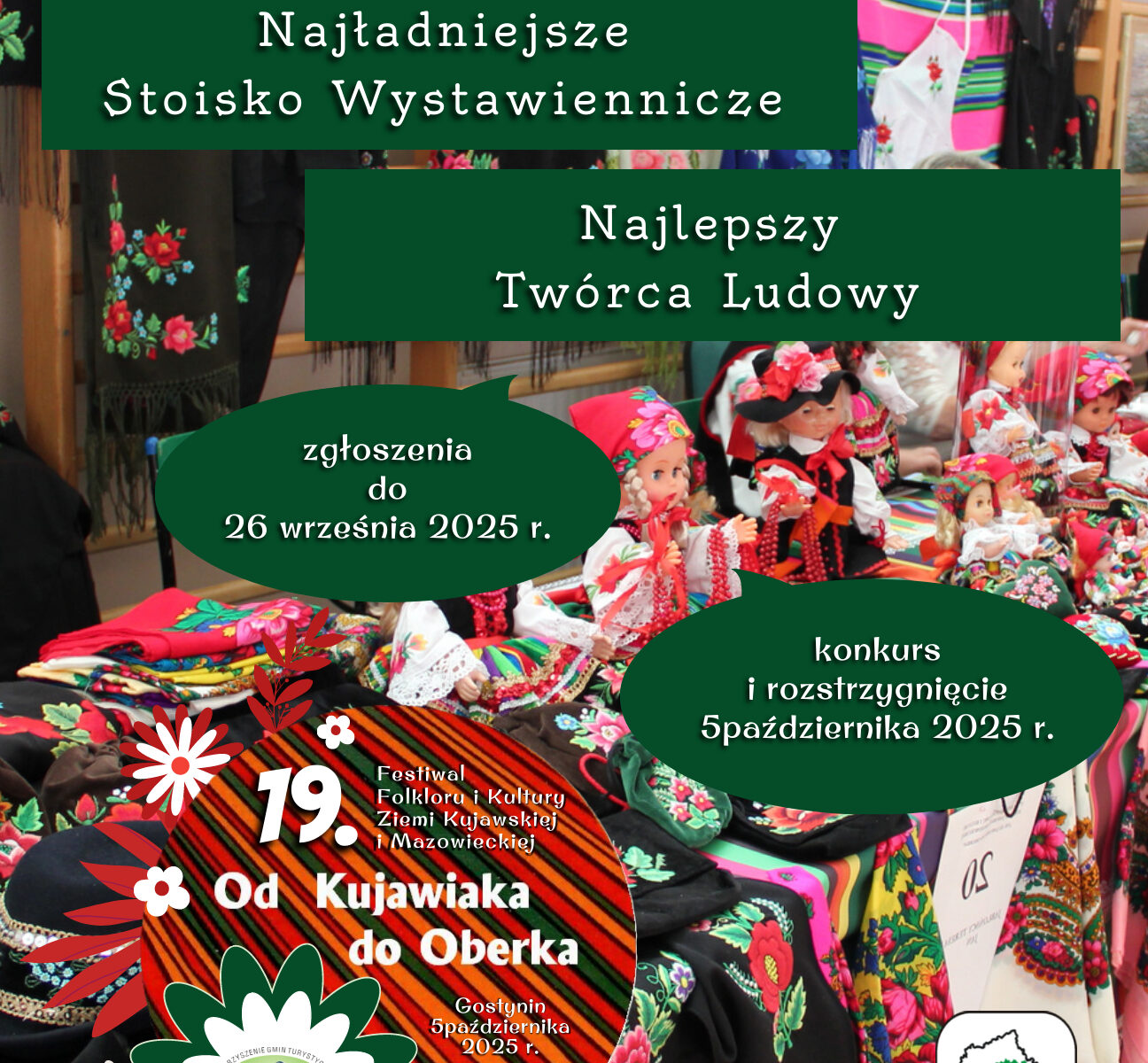 Serdecznie zapraszamy do udziału w konkursie na „Najładniejsze Stoisko Wystawiennicze” oraz na „Najlepszego Twórcę Ludowego”, który odbędzie się na corocznym 19 już Festiwalu Folkloru i Kultury Ziemi Kujawskiej i Mazowieckiej „Od Kujawiaka do Oberka” dnia 5 października 2025 r. w Hali Sportowej MOSiR przy ul. Kutnowskiej 7A (koło basenu) w Gostyninie.